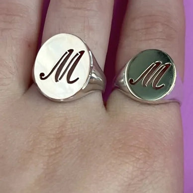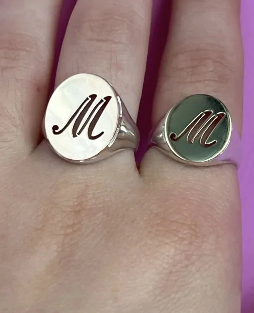 La parte superiore dell’ anello è un ovale in oro 18 kt ed è personalizzabile con un’iniziale a traforo (inserire nel box)
