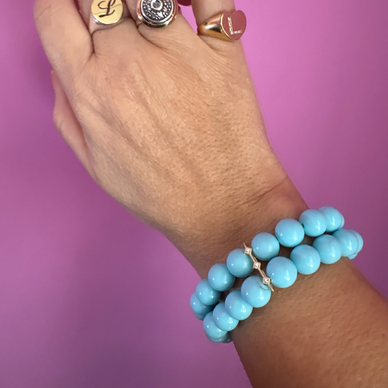Doppio filo di sfere di turchese liscio (pasta ottima qualità): questo bracciale elasticizzato unisce la luminosità del turchese a due barrette in argento 925 placcato oro giallo, impreziosite da zirconi scintillanti.